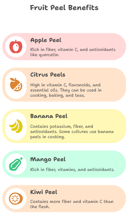 Peels often contain vitamin C, polyphenols, flavonoids, and dietary fiber, which help combat oxidative stress and support gut health.