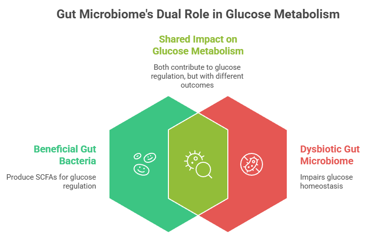 The gut microbiome influences glucose homeostasis through microbial metabolites (notably SCFAs), modulation of incretin hormones (GLP-1, GIP), and regulation of systemic inflammation. Beneficial taxa such as Akkermansia muciniphila and Faecalibacterium prausnitzii improve insulin sensitivity by enhancing gut barrier integrity and reducing endotoxemia, while dysbiosis increases lipopolysaccharide (LPS)-mediated insulin resistance.