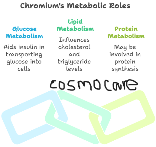 - Role: Helps insulin regulate blood glucose and supports energy metabolism.