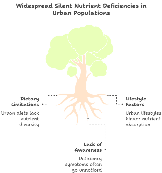 Factors like refined diets, stress, pollution, and reliance on packaged foods increase nutrient demand while lowering intake, making urban populations more vulnerable.