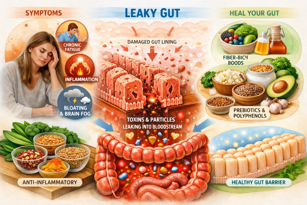Butyrate strengthens tight junction proteins. Glutamine, zinc, and polyphenols also support epithelial repair.