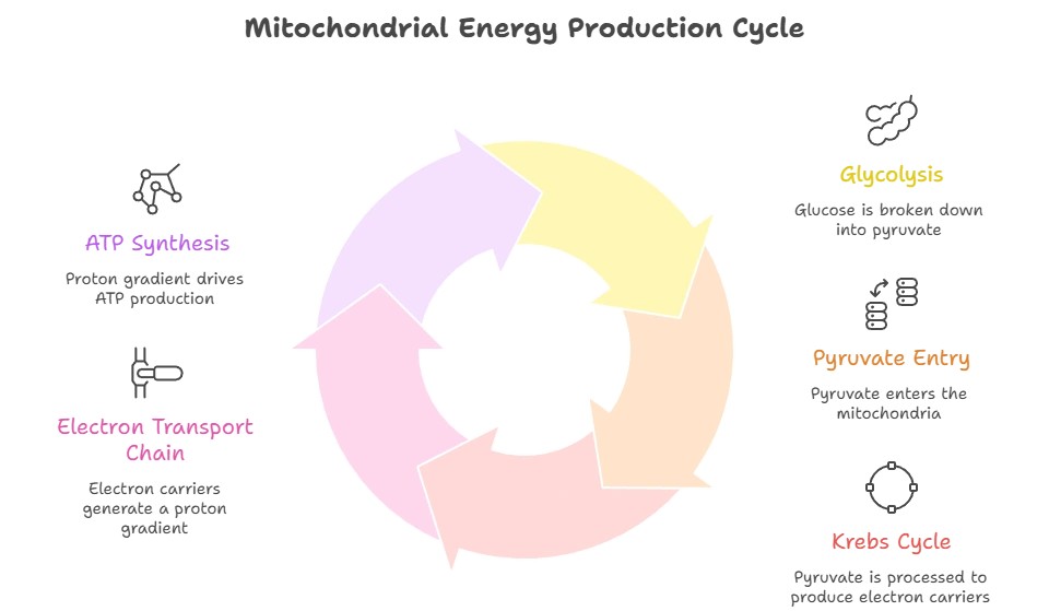 Many people believe energy comes from calories or caffeine. We’re taught that eating enough food provides energy, and that coffee gives us a boost. In reality, food is only potential energy. It must pass through complex chemical reactions inside mitochondria to become usable ATP. This transformation involves multiple steps: the Krebs cycle, electron transport chain, and oxidative phosphorylation—processes that require specific nutrients, proper oxygen utilization, and healthy mitochondrial membranes to function optimally.