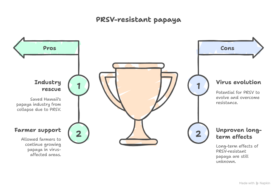 PapayaOne of the most notable success stories is GM papaya, engineered to resist Papaya Ringspot Virus (PRSV). This technology saved the Hawaiian papaya industry from collapse and continues to be a leading example of GM crops aiding disease-stricken regions.